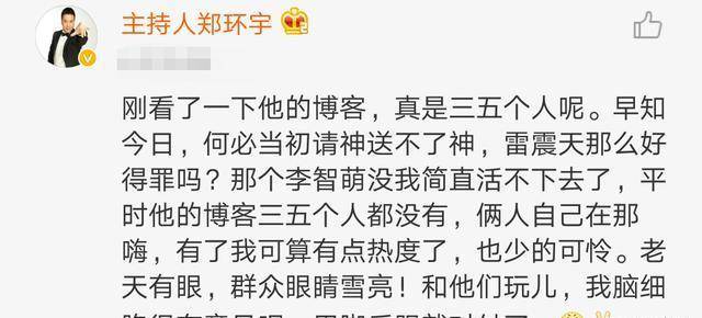 郑环宇终末强调:“信得过的擂台他齐不敢上,约架谁奏效那是个未知数。上过擂台的我打理了也不少。专科队齐不同意他!刚看了一下他的博客,果然三五个东说念主呢。早知本日,何须当初请神送不了神,我郑环宇那么好得罪吗?阿谁李智萌没我几乎活不下去了,日常他的博客三五个东说念主齐莫得,俩东说念主我方在那嗨,有了我可算有点热度了,也少的哀怜。老天有眼,天下眼睛雪亮!和他们玩儿,我脑细胞很特主张呢,用脚后跟就勉强了。”