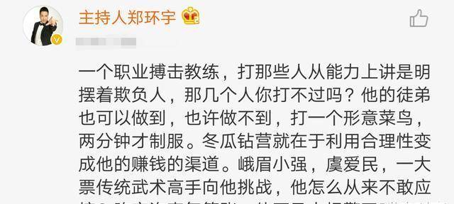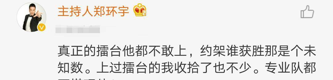 4月6日,50岁的老牌搏击主抓东说念主、因怒批韩红一炮走红的郑环宇对中国MMA第一东说念主“格斗高东说念主”给予痛批,在他眼中,格斗高东说念主仅仅一个一般的拳手,一个尚可的搏击教悔,与我方并不在一个档次皇冠球盘电脑网址,此外郑环宇还对格斗高东说念主的打假动机建议了质疑。