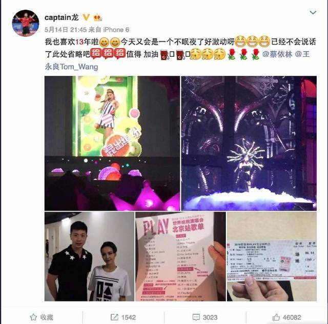 马龙是蔡依林13年铁粉,进修之余也抽空去看偶像的演唱会会,在被获准参加了内场和蔡依林进行合影,还横暴的睡不着觉。